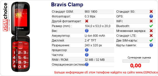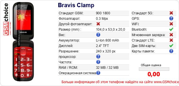 У Тебя есть свой сайт? Хочешь где-то разместить информацию о базовых данных мобильника Bravis Clamp ? Это запросто устроить. Достаточно скачать картинку или скопировать и разместить на соответствующем сайте нижерасположенный код:Размещение этого кода вызовет появление нижерасположенной картинки: