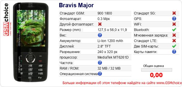 У Тебя есть свой сайт? Хочешь где-то разместить информацию о базовых данных мобильника Bravis Major ? Это запросто устроить. Достаточно скачать картинку или скопировать и разместить на соответствующем сайте нижерасположенный код:Размещение этого кода вызовет появление нижерасположенной картинки: