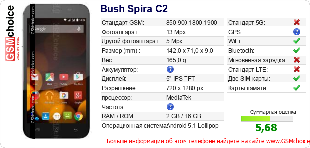 Данные о телефоне Bush Spira C2 на Вашем сайте