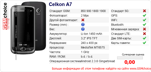 У Тебя есть свой сайт? Хочешь где-то разместить информацию о базовых данных мобильника Celkon A7 ? Это запросто устроить. Достаточно скачать картинку или скопировать и разместить на соответствующем сайте нижерасположенный код:Размещение этого кода вызовет появление нижерасположенной картинки:
