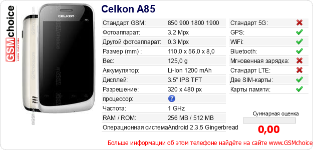 У Тебя есть свой сайт? Хочешь где-то разместить информацию о базовых данных мобильника Celkon A85 ? Это запросто устроить. Достаточно скачать картинку или скопировать и разместить на соответствующем сайте нижерасположенный код:Размещение этого кода вызовет появление нижерасположенной картинки: