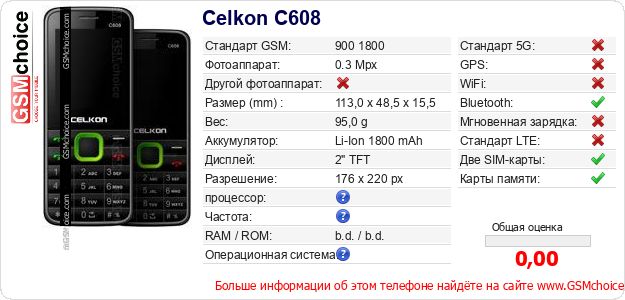 У Тебя есть свой сайт? Хочешь где-то разместить информацию о базовых данных мобильника Celkon C608 ? Это запросто устроить. Достаточно скачать картинку или скопировать и разместить на соответствующем сайте нижерасположенный код:Размещение этого кода вызовет появление нижерасположенной картинки: