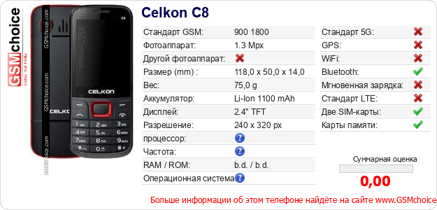 У Тебя есть свой сайт? Хочешь где-то разместить информацию о базовых данных мобильника Celkon C8 ? Это запросто устроить. Достаточно скачать картинку или скопировать и разместить на соответствующем сайте нижерасположенный код:Размещение этого кода вызовет появление нижерасположенной картинки:
