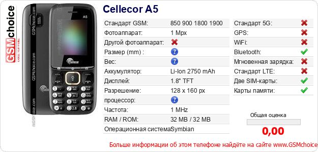 У Тебя есть свой сайт? Хочешь где-то разместить информацию о базовых данных мобильника Cellecor A5 ? Это запросто устроить. Достаточно скачать картинку или скопировать и разместить на соответствующем сайте нижерасположенный код:Размещение этого кода вызовет появление нижерасположенной картинки: