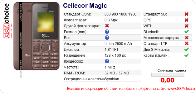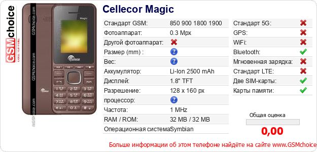 У Тебя есть свой сайт? Хочешь где-то разместить информацию о базовых данных мобильника Cellecor Magic ? Это запросто устроить. Достаточно скачать картинку или скопировать и разместить на соответствующем сайте нижерасположенный код:Размещение этого кода вызовет появление нижерасположенной картинки: