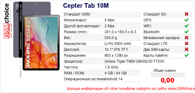 Данные о телефоне Cepter Tab 10M на Вашем сайте