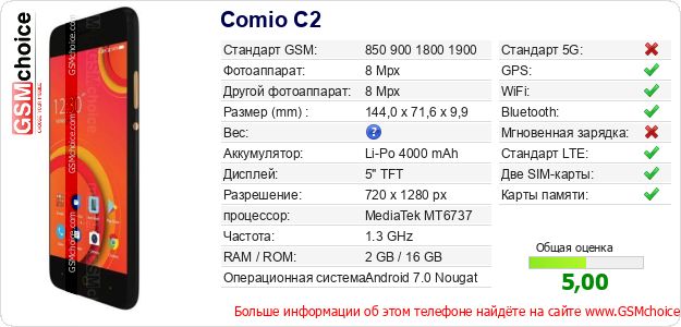 Данные о телефоне Comio C2 на Вашем сайте