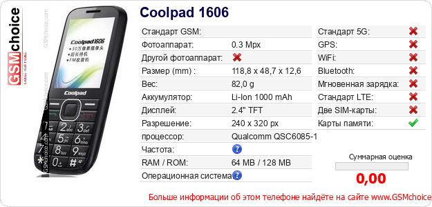 Данные о телефоне Coolpad 1606 на Вашем сайте