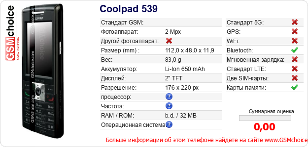 Данные о телефоне Coolpad 539 на Вашем сайте
