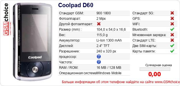 Данные о телефоне Coolpad D60 на Вашем сайте