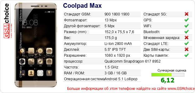 У Тебя есть свой сайт? Хочешь где-то разместить информацию о базовых данных мобильника Coolpad Max ? Это запросто устроить. Достаточно скачать картинку или скопировать и разместить на соответствующем сайте нижерасположенный код:Размещение этого кода вызовет появление нижерасположенной картинки: