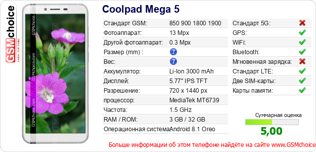 Данные о телефоне Coolpad Mega 5 на Вашем сайте