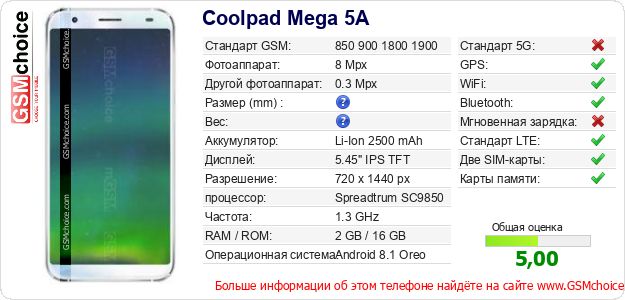 Данные о телефоне Coolpad Mega 5A на Вашем сайте