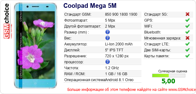 Данные о телефоне Coolpad Mega 5M на Вашем сайте