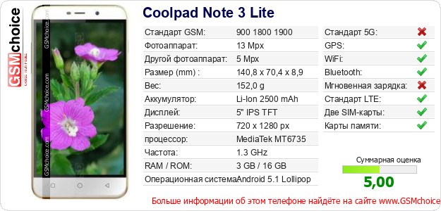 Данные о телефоне Coolpad Note 3 Lite на Вашем сайте