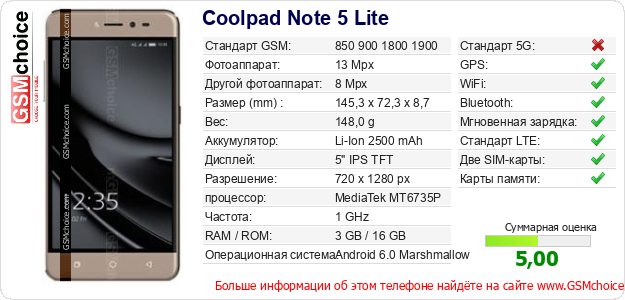 Данные о телефоне Coolpad Note 5 Lite на Вашем сайте