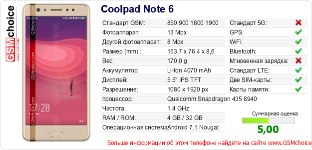 Данные о телефоне Coolpad Note 6 на Вашем сайте