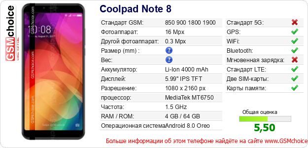 Данные о телефоне Coolpad Note 8 на Вашем сайте