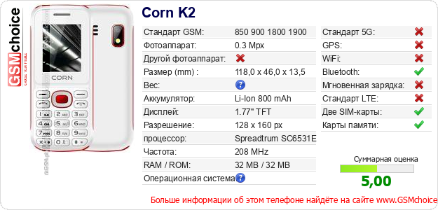 У Тебя есть свой сайт? Хочешь где-то разместить информацию о базовых данных мобильника Corn K2 ? Это запросто устроить. Достаточно скачать картинку или скопировать и разместить на соответствующем сайте нижерасположенный код:Размещение этого кода вызовет появление нижерасположенной картинки: