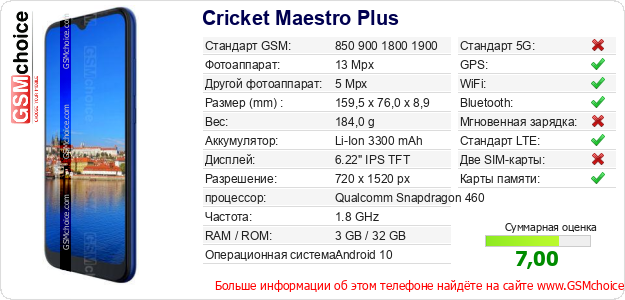 Данные о телефоне Cricket Maestro Plus на Вашем сайте