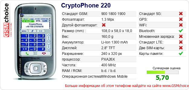 Данные о телефоне CryptoPhone 220 на Вашем сайте