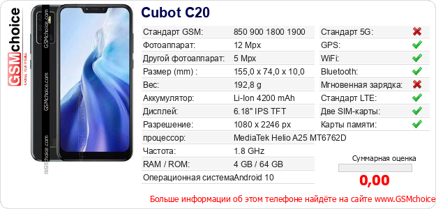 У Тебя есть свой сайт? Хочешь где-то разместить информацию о базовых данных мобильника Cubot C20 ? Это запросто устроить. Достаточно скачать картинку или скопировать и разместить на соответствующем сайте нижерасположенный код:Размещение этого кода вызовет появление нижерасположенной картинки: