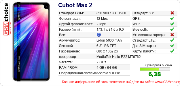 Данные о телефоне Cubot Max 2 на Вашем сайте