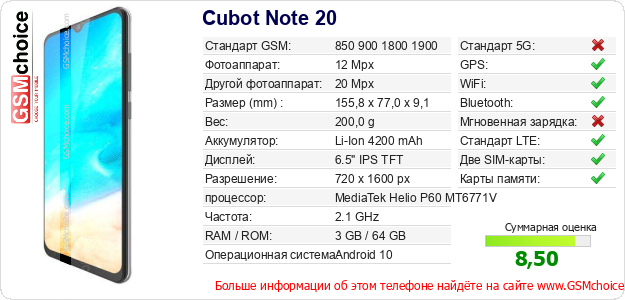 Данные о телефоне Cubot Note 20 на Вашем сайте