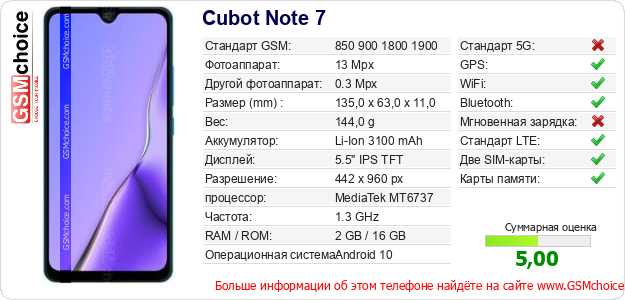 Данные о телефоне Cubot Note 7 на Вашем сайте