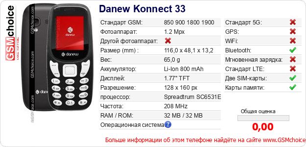 Данные о телефоне Danew Konnect 33 на Вашем сайте