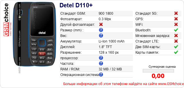 Данные о телефоне Detel D110+ на Вашем сайте