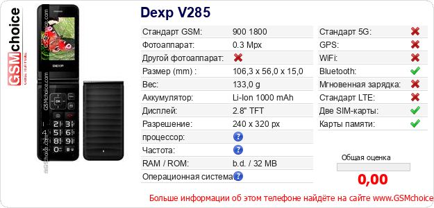 У Тебя есть свой сайт? Хочешь где-то разместить информацию о базовых данных мобильника Dexp V285 ? Это запросто устроить. Достаточно скачать картинку или скопировать и разместить на соответствующем сайте нижерасположенный код:Размещение этого кода вызовет появление нижерасположенной картинки: