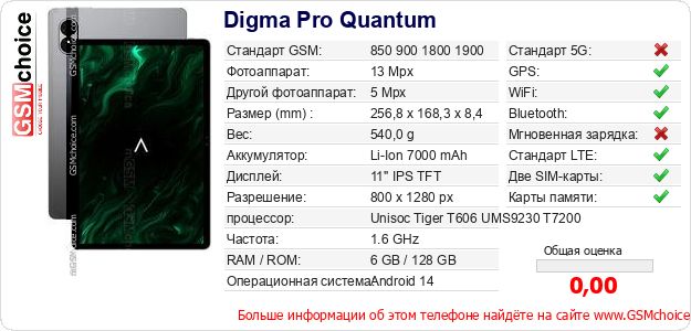 Данные о телефоне Digma Pro Quantum на Вашем сайте