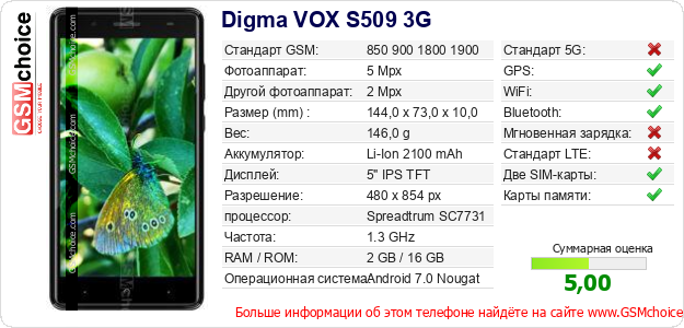 Данные о телефоне Digma VOX S509 3G на Вашем сайте