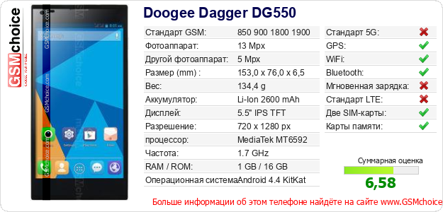 Данные о телефоне Doogee Dagger DG550 на Вашем сайте