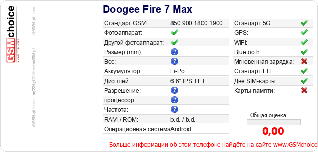 Данные о телефоне Doogee Fire 7 Max на Вашем сайте