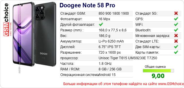 Данные о телефоне Doogee Note 58 Pro на Вашем сайте