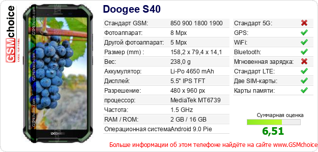 У Тебя есть свой сайт? Хочешь где-то разместить информацию о базовых данных мобильника Doogee S40 ? Это запросто устроить. Достаточно скачать картинку или скопировать и разместить на соответствующем сайте нижерасположенный код:Размещение этого кода вызовет появление нижерасположенной картинки: