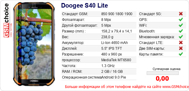 Данные о телефоне Doogee S40 Lite на Вашем сайте