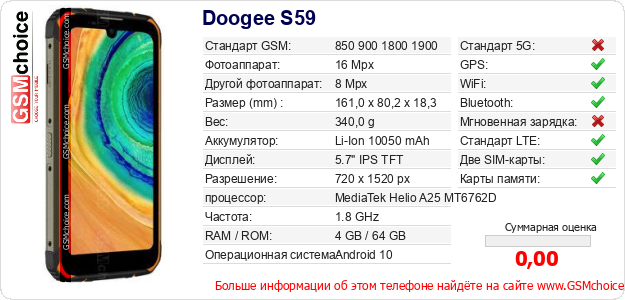 Данные о телефоне Doogee S59 на Вашем сайте