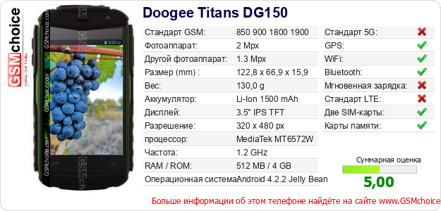 У Тебя есть свой сайт? Хочешь где-то разместить информацию о базовых данных мобильника Doogee Titans DG150 ? Это запросто устроить. Достаточно скачать картинку или скопировать и разместить на соответствующем сайте нижерасположенный код:Размещение этого кода вызовет появление нижерасположенной картинки: