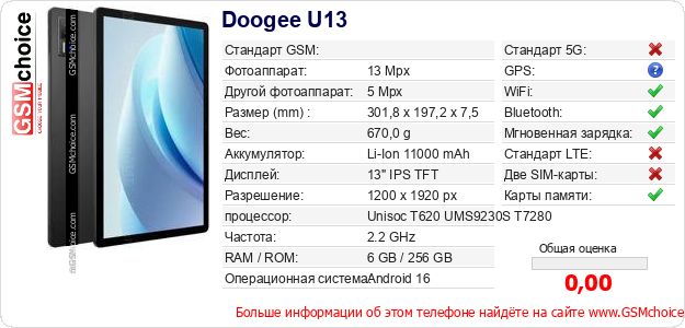 Данные о телефоне Doogee U13 на Вашем сайте