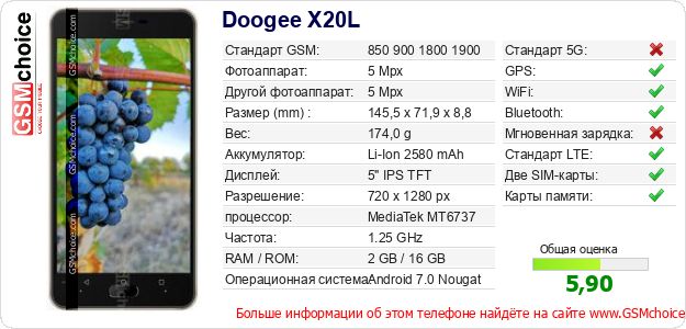 Данные о телефоне Doogee X20L на Вашем сайте