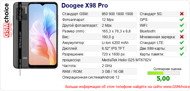 Данные о телефоне Doogee X98 Pro на Вашем сайте