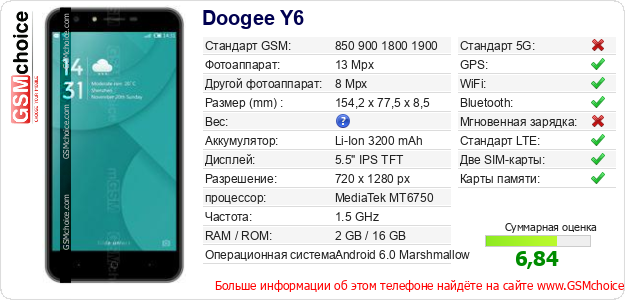 Данные о телефоне Doogee Y6 на Вашем сайте