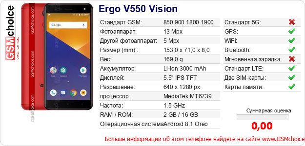 Данные о телефоне Ergo V550 Vision на Вашем сайте