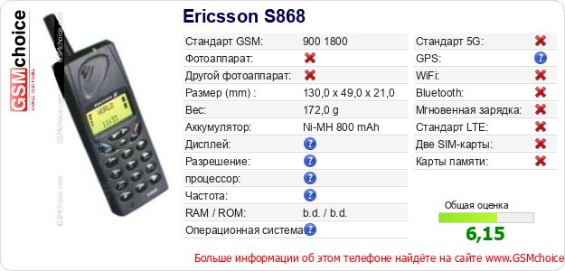 Данные о телефоне Ericsson S868 на Вашем сайте