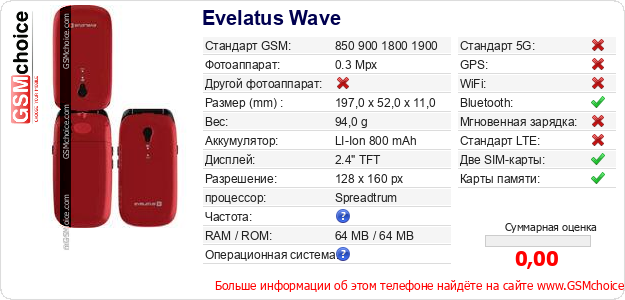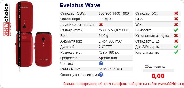Данные о телефоне Evelatus Wave на Вашем сайте