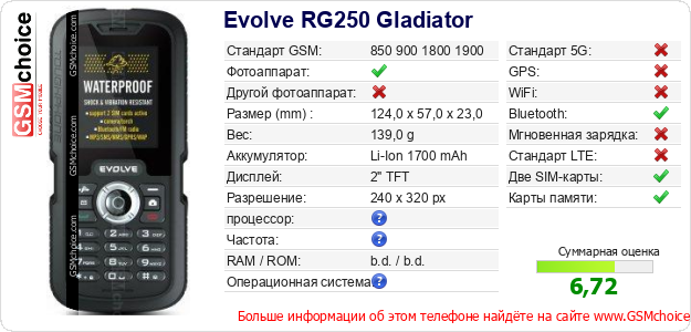 Данные о телефоне Evolve RG250 Gladiator на Вашем сайте