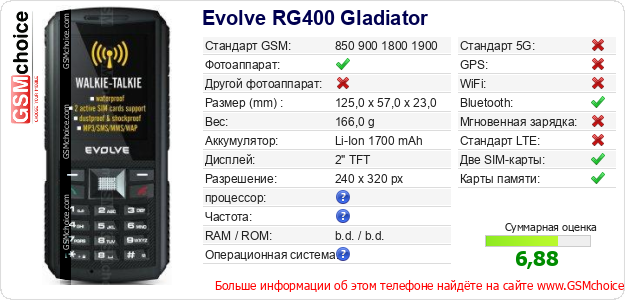 Данные о телефоне Evolve RG400 Gladiator на Вашем сайте